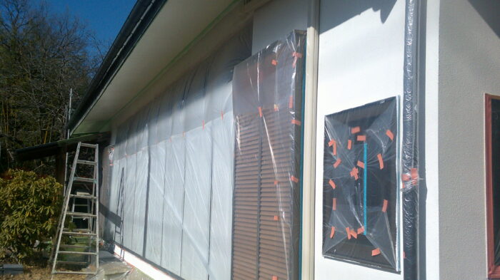 吹付で柄を付けるため養生も徹底して行います。