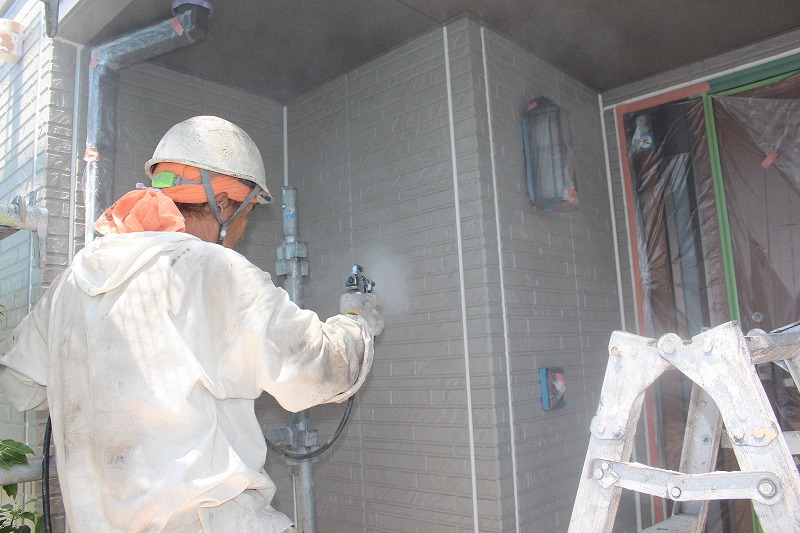 凹凸の深いサイディングでしたので、仕上がりの美しさを考え下塗りから上塗りまで吹付を選択。