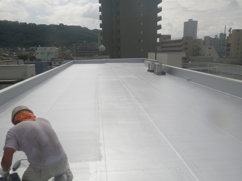 お盆の連休明けから工事をしていた甲府市のAビル様の屋上塗装が仕上がりました!