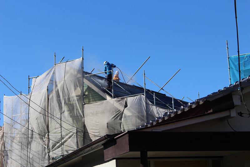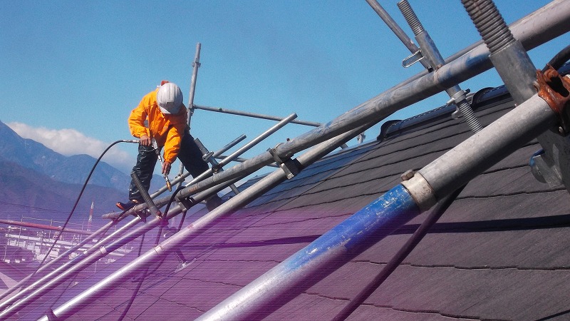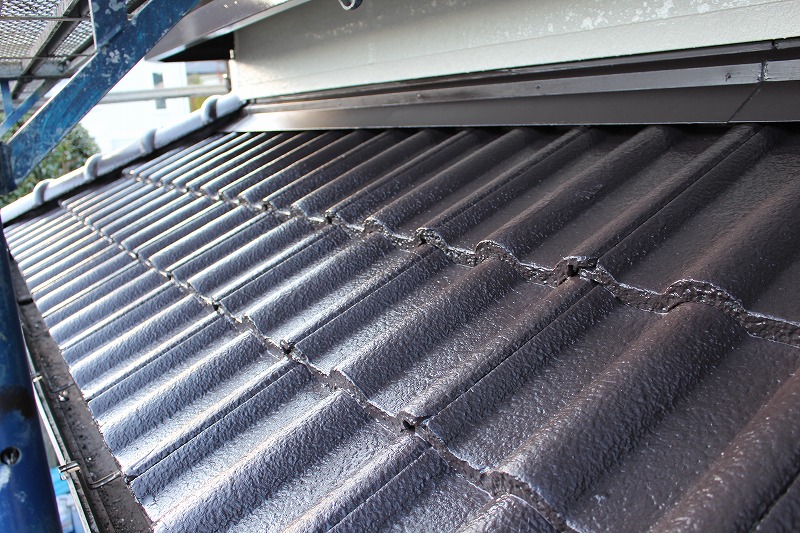 2014.10.31 モニエル瓦塗料ナノシリコン 先日ご紹介しましたモニエル瓦用下地材スラリー強化プライマー。 本日は中塗り、上塗り用ナノシリコンを塗装しました! 吹き付けによる塗装。 半分が下塗り状態、半分が中塗り状態。 非常に手間のかかる屋根瓦です・・・。