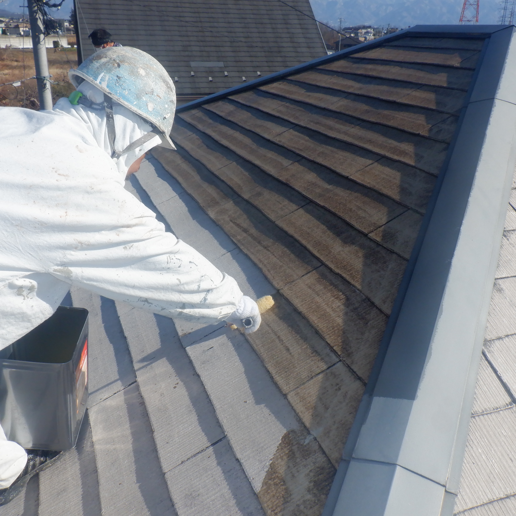 屋根の傷みがありましたので刷毛で細かい部分までしっかり塗装しその後からローラーどぇ中塗りを行いました。