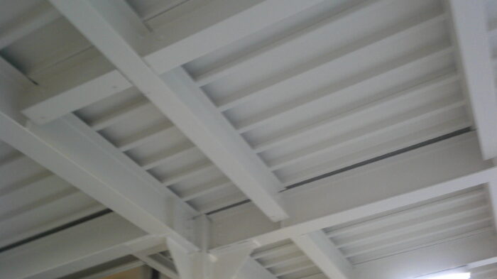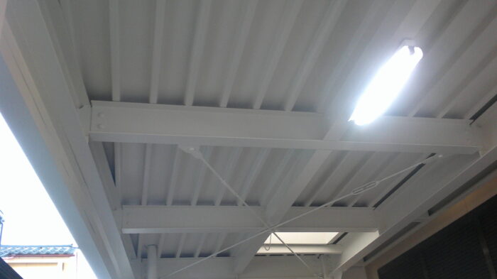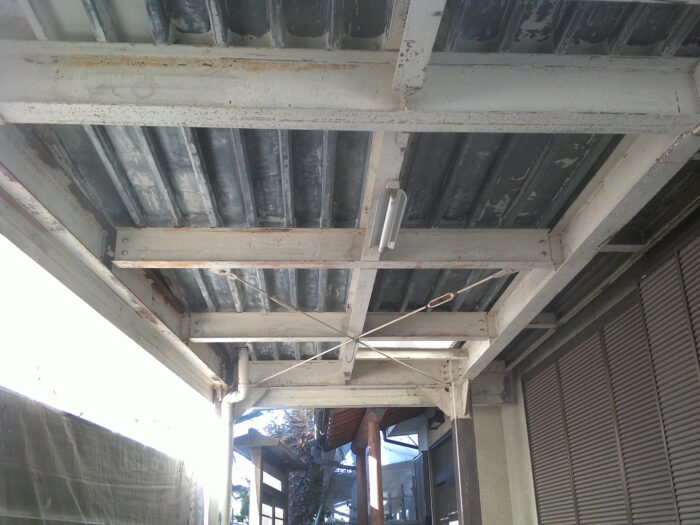 鉄骨部分はサンダーケレンと手作業でのケレンを行いサビや剥がれを取り除き錆止めをしました。